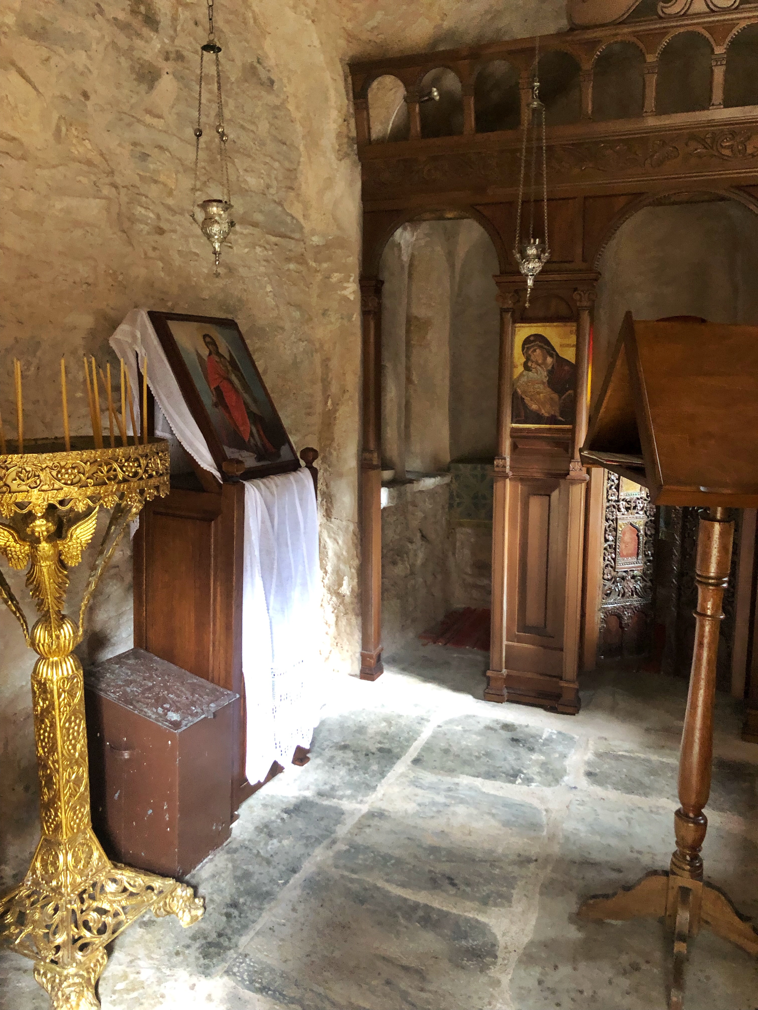 Giannis zipped us around tight curves and down streets that were sized to be sidewalks in his very clean 1990’s silver Mercedes with reasonably effective air conditioning. He delivered us to the mother of the owner of our Airbnb, who spoke absolutely no English but whose pride in the inn needed no words. Mary showed us the two story home, pointed out the beautiful patio, and left us with homemade strawberry jam and biscuits.