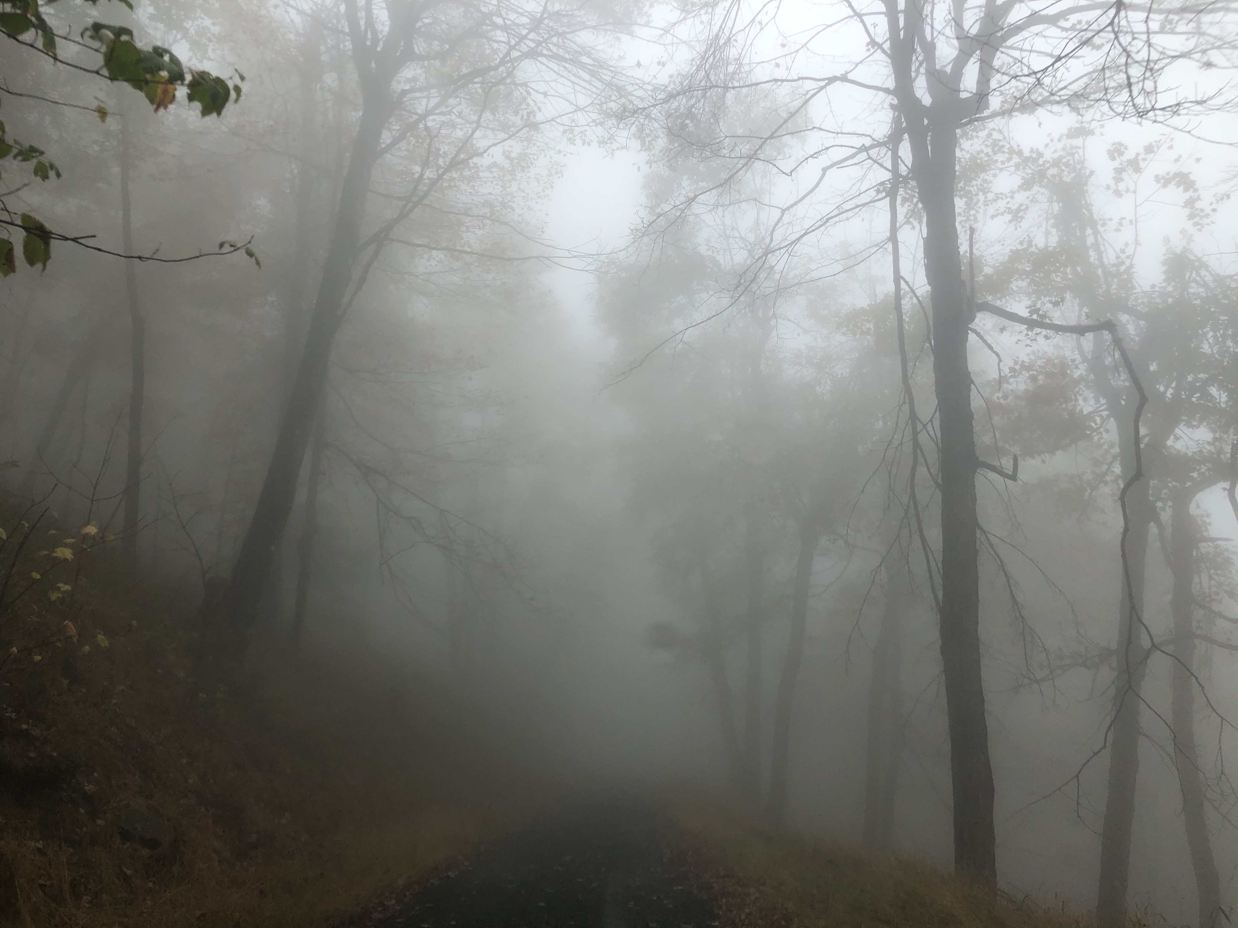 On the way home we drove the back roads to Swover Creek Farms. I should have expected treacherous roads given it was a 17-mile trip that Google predicted would take 46 minutes. Alas, when we made one hairpin turn directly into a wall of fog so thick we couldn’t see the next z-turn, I wondered if I’d made a serious error picking this route. But driving very, very slowly up and then down the mountain in the mist, I felt like an adventurer and expected a Civil War soldier to emerge from the fog. With each switchback on the descent, the yellows and oranges of the changing leaves got a bit more vibrant.