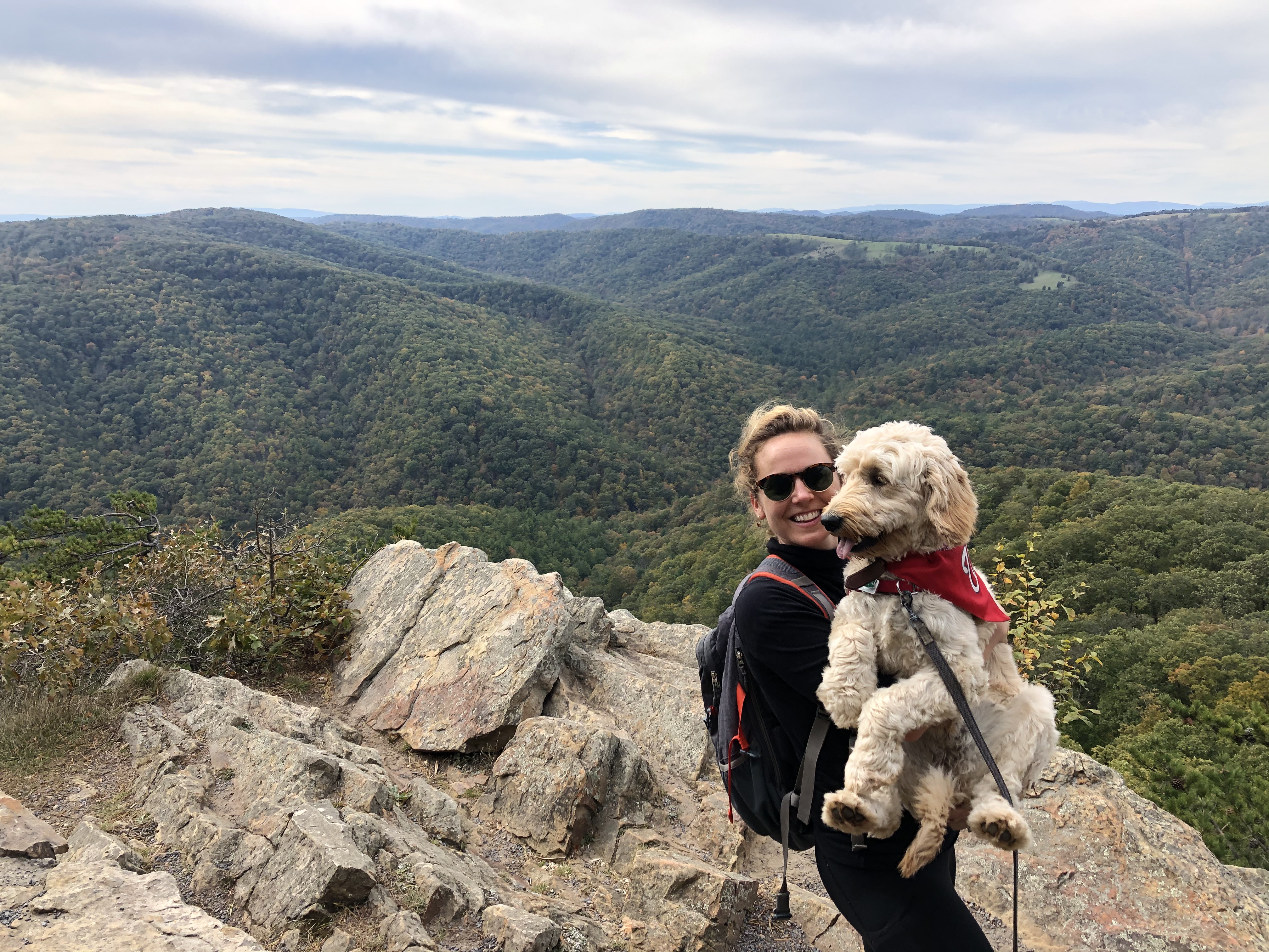 Next up: Lost River State Park. AllTrails showed a number of loops in the park, we settled on a 5.8-mile loop from White Oak to Big Ridge. It starts as a horse trail, so mind your step. We found it a little hard to look down at our feet because the views were so stunning. The first two miles are consistently uphill, the third mile flattens out save for one big climb that takes you to Cranny Crow Overlook where you can see from Shenandoah County in Virginia past Hardy County in West Virginia. This stone shelter begs for a picnic. Or an Instagram engagement. We did neither, but did stop share some dog treats with another couple and their pooch who didn’t want to share his shelter.