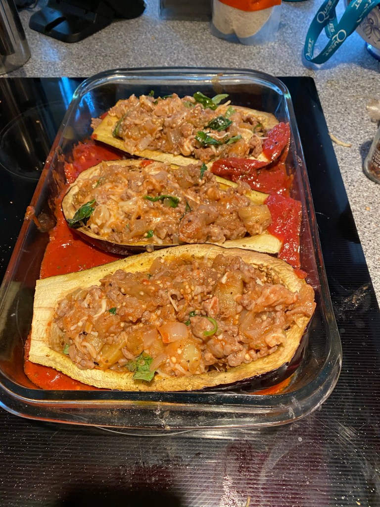 While they’re roasting, saute the filling. The filling should be some combination of the scooped-out eggplant parts, diced to 1-2 inch chunks, about one pound of ground meat (I prefer pork and turkey), or a comparable amount of veggies and lentils. When the eggplant chunks have started to stick to the pan and are soft, add a scoop of marinara sauce and some fresh basil and remove from the heat but let it keep cooking for a bit.