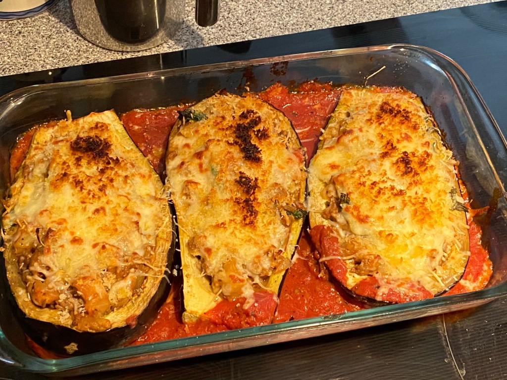 Return the filled, topped boats to the oven to heat it all up together for 10-14 minutes. After cooking a bit, increase the oven temperature to broil to brown the cheese/bread crumb topping. When it’s golden brown, remove from oven and serve.