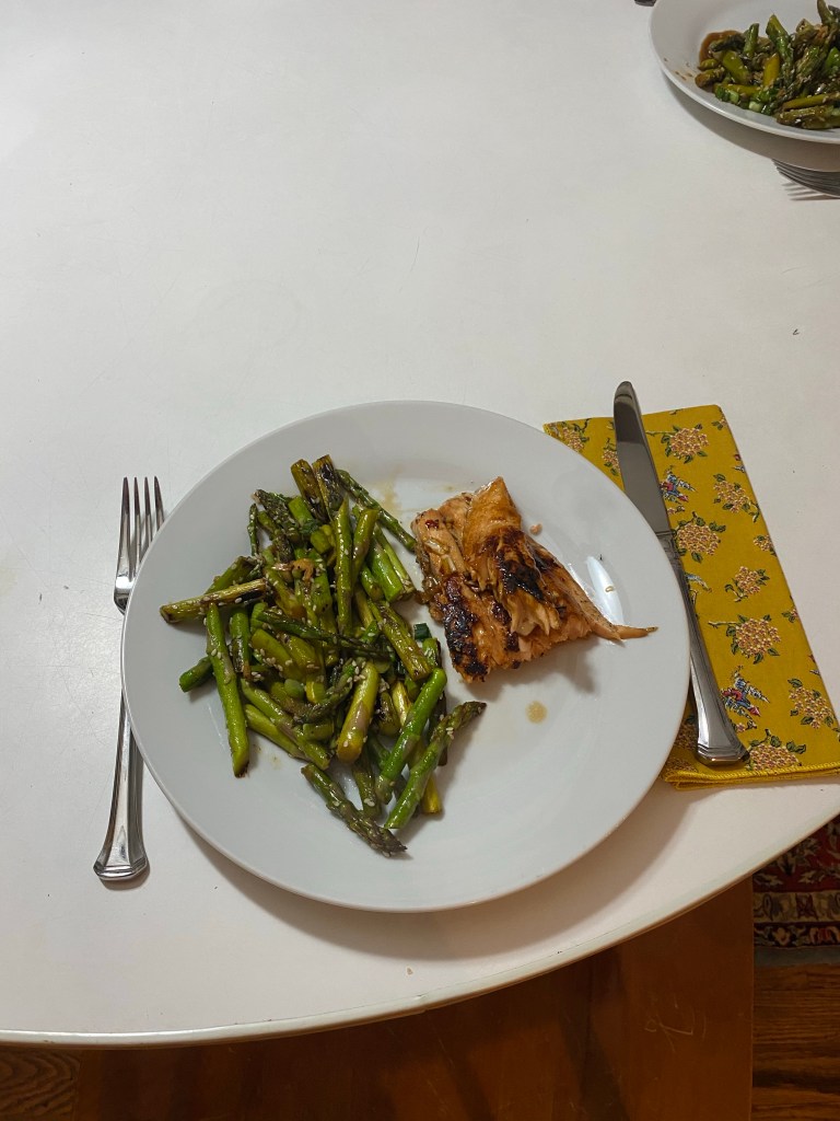 This quick meal still calls for a marinade, and I’ve found that the perfect activity to do between endless conference calls is some sort of dinner prep work. Whereas in my old life I’d, say, walk and catch up with a colleague about so-and-so’s outfit or grab a coffee at Blue Stone Lane, these days, I have to forcibly remove myself from my basement “desk” to take mental breaks. Dinner prep also keeps my hands busy enough that I don’t snack (and snack and snack and snack). The marinade is an easy soy and honey marinade, I’m sure you’ve read lots of them from insta-cooks and other places, they’re all variations on a pretty solid theme. The asparagus is my side dish take on Smitten Kitchen’s Asparagus Stir Fry.