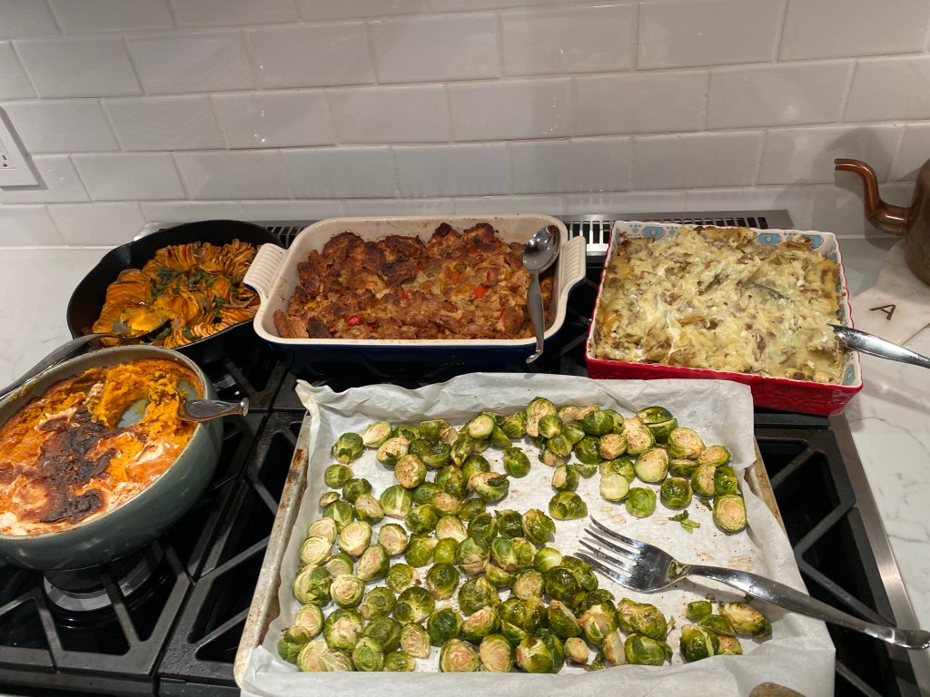 I’m grateful for a kitchen that has six burners and a three-shelf oven, because everything could be cooked at the same time and with only a little bit of oven-Tetris.